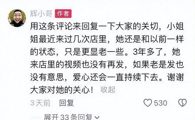 陈辉想着,就她从自己店里“买走”的那些食物其他应该不足以满足她的需要,于是,他将他们的一次购物录像原原本本的放在了自己抖音上。很快,他知道了,除了自己以外,还是有很多人、很多店帮过她。奶茶店会给那个总穿灰外套的她免费续杯,面包房经理会主动让外卖员给她捎带店里促销试吃的糕点…… 不过,陈辉最最高兴的是,她认识他!偶然在小街相遇时,她会难得的咧嘴一笑!陈辉说,就这就让他觉得继续帮下去特别的值得。 陈辉没有接受他人捐款,他觉得大家都不易,而他现在做的,他和家里完全可以承受。 陈辉也没有接受商业活动,他怕打扰她宁静的小世界。
